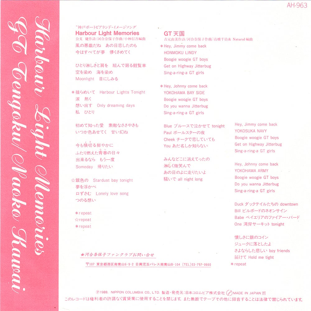 B面「GT天国」もテンション高くかわいい奈保子。ヘイ・ジミー・カンバック!ヨーコハマ・ベイサイッ!っとチャキチャキにまくしたてる歌詞が楽しいポップ・ロック・チューン。納得行かない変換上位にランクインする、ジルバの原語〝JITTERBUG〟の舌を噛みそうな発音もがんばっており応援したくなる。元気印のガール・ポップ名作です。