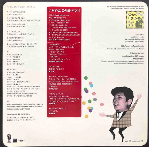 京都のお座敷ロックンローラー:バンヒロシ伝説の'84年作「バンちゃんとロック」をセンスの塊なジャケットデザインで復刻した'96年発売の10"盤。「いかすぜこいつ!」で君もチャックをぶっ飛ばすんだ!!