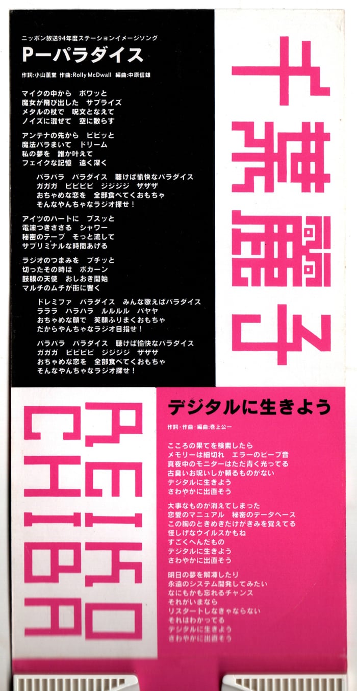 カップリング収録の「デジタルに生きよう」は作詞・作曲・編曲:巻上公一によるクラフトワークなテクノ・ミディアム!こちらもやはりチバレイの破壊力満点のヴォーカルが炸裂しているわけですが、酔ってしまいそうな不安定さで曲を後押ししており、より奇天烈に響いているのが最高です。あまり見ない短冊♪