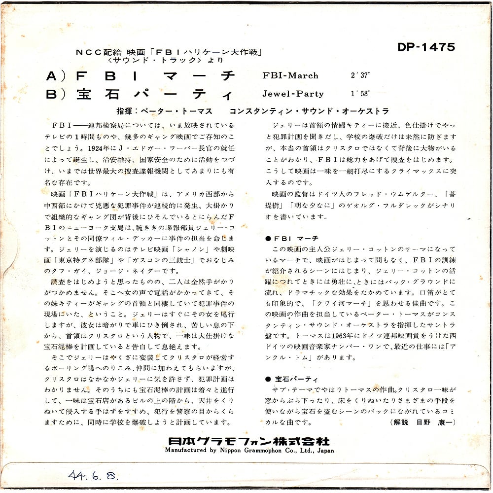 音楽はドイツの音楽家、ペーター・トーマス PETER THOMAS が担当しています。A面「FBIマーチ FBI March 」は主人公、ジェリー・コットンのテーマでもあるマーチ楽曲。「クワイ河マーチ」とか「大脱走マーチ」とか当時の流れを汲んでいるのでしょうが、スタイリッシュ活劇なのにマーチがメインテーマなのドイチェっぽいです。ただ勇壮な行進曲というわけでもなく、口笛をフューチュアするなどドラマティカルに展開していてなかなかユニーク。