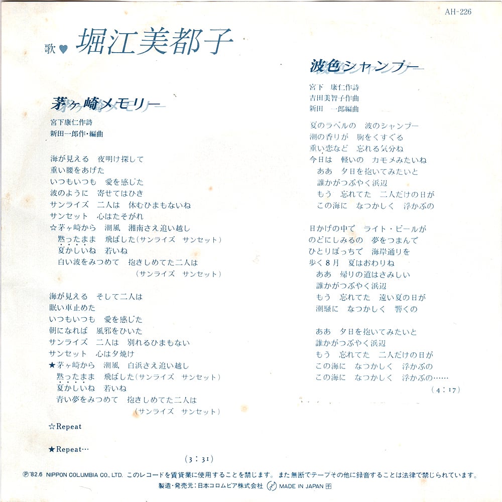 堀江美都子が1982年に発売したシングル「茅ヶ崎メモリー」です。作詞:宮下康仁、作・編曲:新田一郎による儚さ満点サマー・ディスコ歌謡の大傑作!