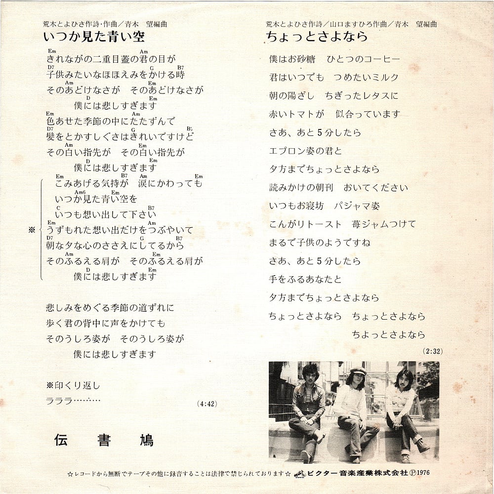 作詞家の荒木とよひさがベーシストとして参加しているフォーク・グループ、伝書鳩の1976年発売・4thシングル「いつか見た青い空」です。ドラマ主題歌に起用されヒットした前シングル「目覚めたときには晴れていた」(ビリー・バンバンのカバー)の印象が強すぎて地味な扱いを受けていそうですが、B面収録の「ちょっとさよなら」がとっても瑞々しいフォーキー・ボッサで胸の中にすっきり爽やかな風が吹きます。まさに清涼剤のような‥と言いたいところですが、清涼剤ってよく考えると昨今伝わりづらそうだし、歌詞の世界感がなんともスウィートなのでチョコミントのような一曲と言っておきます。