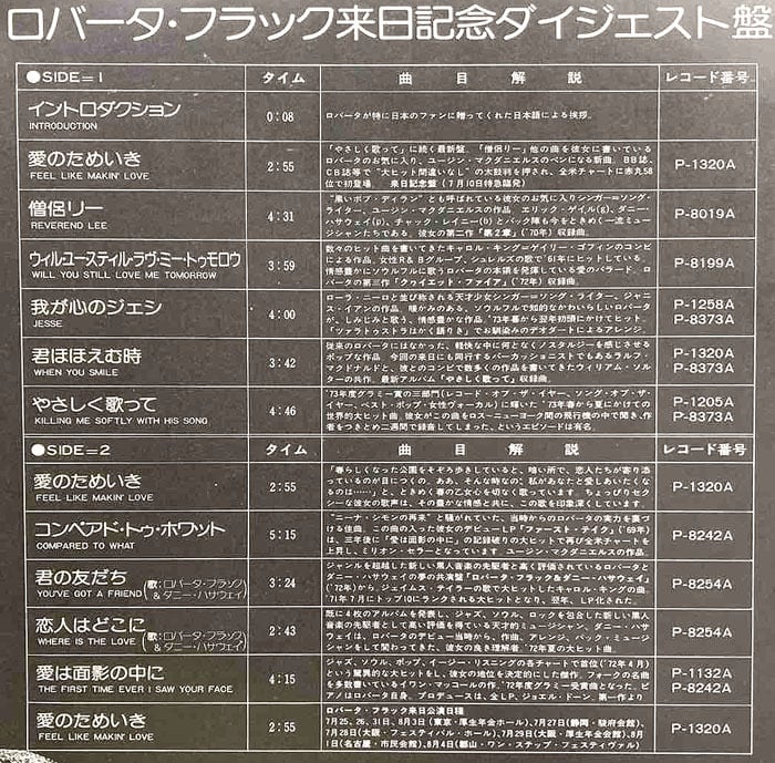 ロバータ・フラックの来日記念ダイジェスト盤LPです。この時点でのベストな選曲ですが、これが貴重なのは「イントロダクション」で彼女の日本語を聴くことが出来るから!!