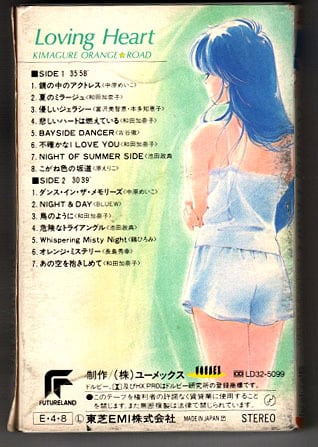 ’89年発売、アニメ『きまぐれオレンジ☆ロード』ヴォーカル曲集『Loving Heart』カセットテープです。「鏡の中のアクトレス」「夏のミラージュ」「危険なトライアングル」等、全15曲収録。