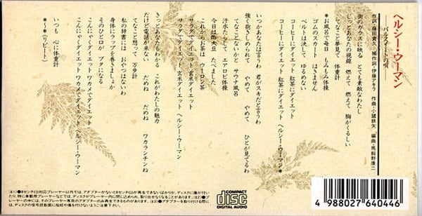 味の素KK「パルスイート」CMソング「ヘルシー・ウーマン」。TVCMでは桜田淳子が歌ってましたが市販版はダイエッツなるグループによるカヴァーになってます。桜田淳子の覆面ワークと書いてる人もいますが、声が違いすぎるから別人歌唱だと思う。