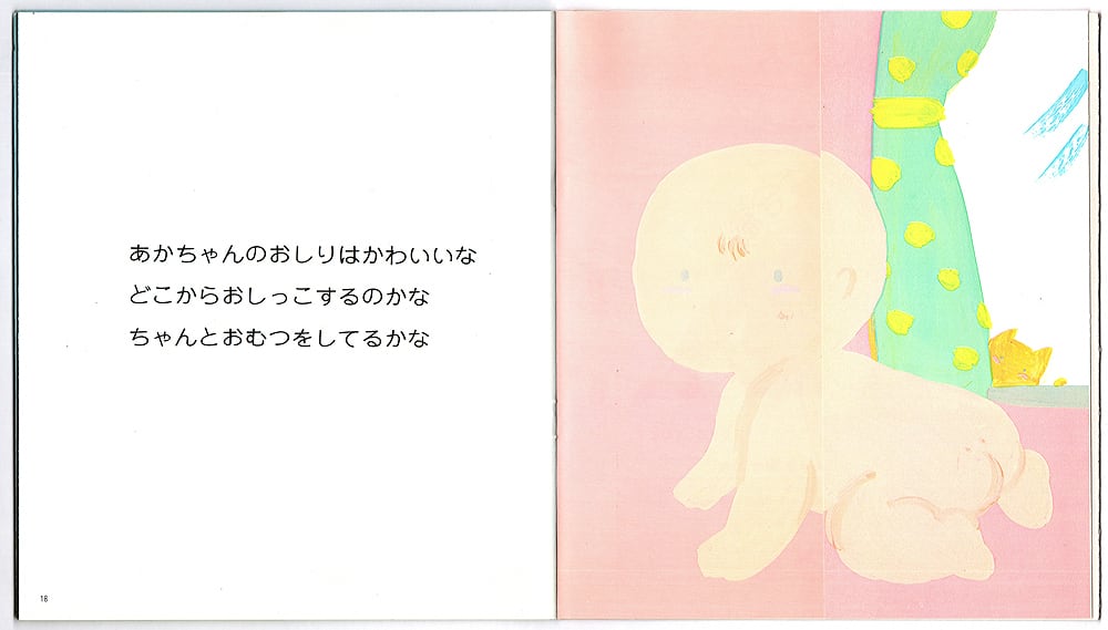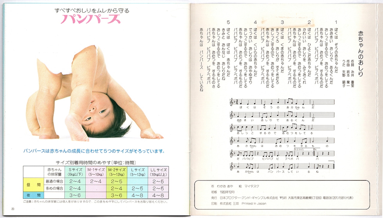 ほわほわしたかわいいイラストの絵本は作:わかおあや、絵:マイタスク。折りたたまれたページを開くと登場人物がおむつをして現れるちょっとしたギミックもあって、配布物らしからぬ凝ったつくり。これだけでも充分うれしいのですが、当時のCMソングだった矢野顕子「赤ちゃんのおしり」のソノシート付属なのが最高でございます。