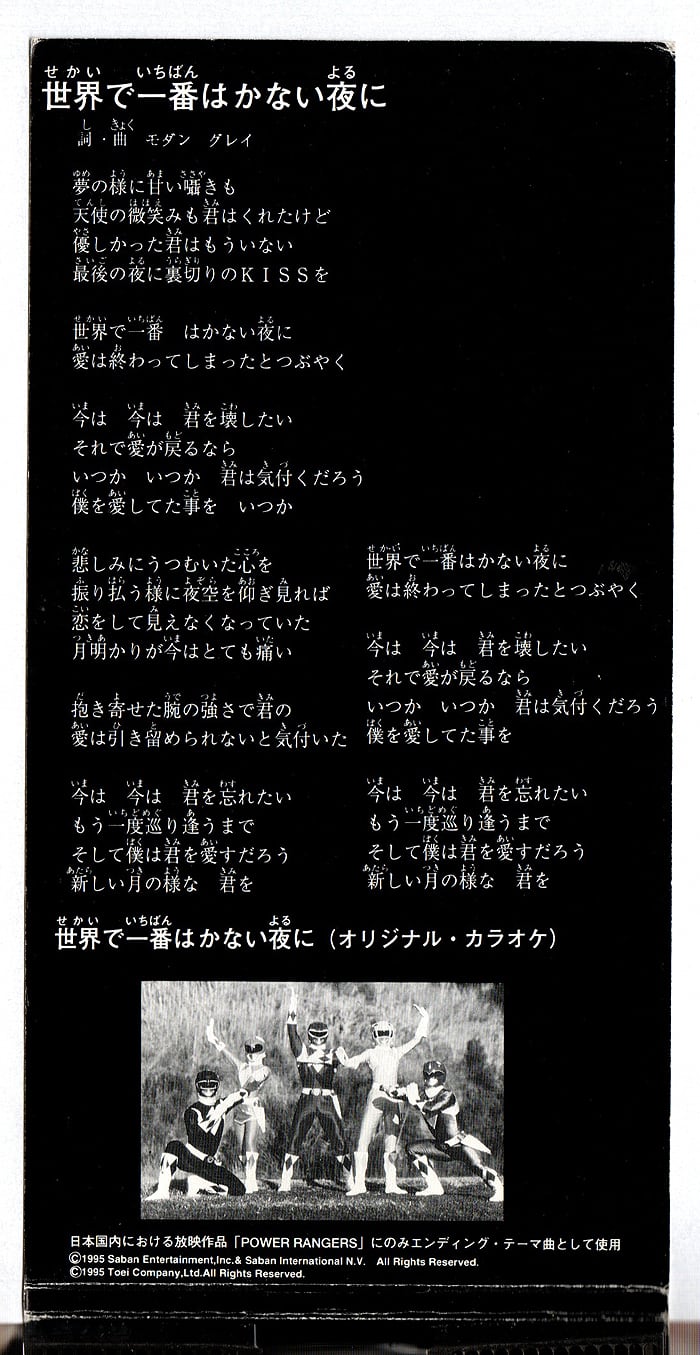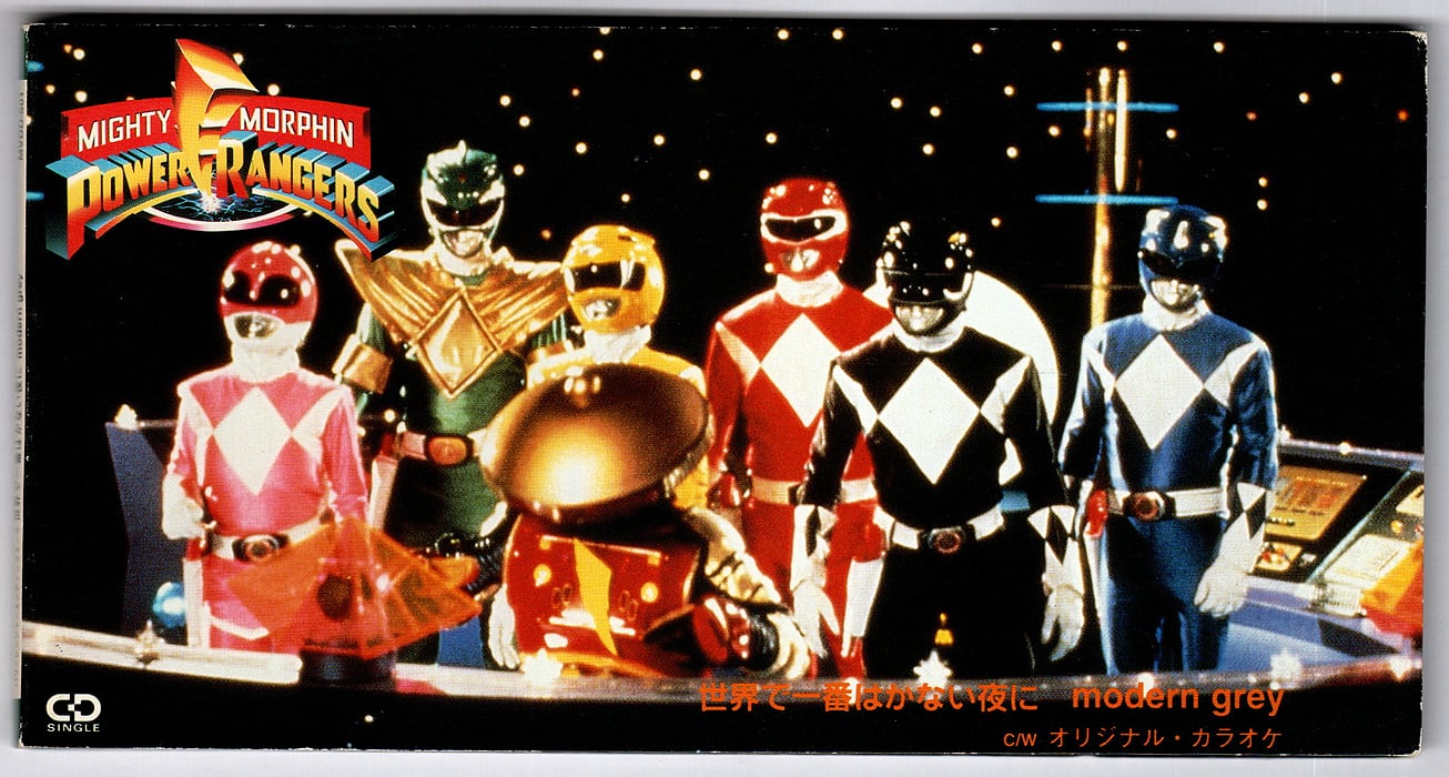 昨年半世紀続いた歴史に幕をおろしたスーパー戦隊シリーズのアメリカ・ローカライズ版として制作された〈パワーレンジャー〉(第一作目、正確にはマイティ・モーフィン・パワーレンジャー Mighty Morphin Power Rangers )。1993~1996年まで3シリーズに渡って制作された人気番組となりました。逆輸入日本放映時に追加された日本独自エンディング・テーマ、Modern Grey モダン・グレイ 「世界で一番はかない夜に」の8cmCDです。