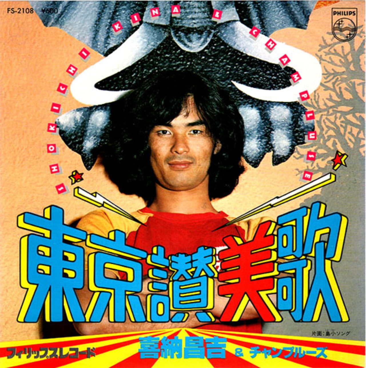インパクト抜群のジャケ!喜納昌吉&チャンプルーズの'78年作「東京讃美歌」7吋盤です。作詞・作曲:照屋林助、編曲:矢野誠。沖縄とは何もかもが違う東京で感じたあれやこれやを綴り、そして皮肉る‥!