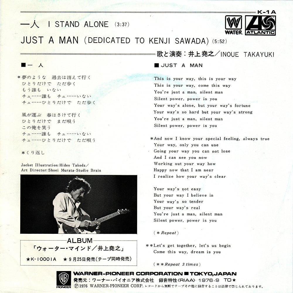 B面「JUST A MAN(DEDICATED TO KENJI SAWADA)」は盟友・沢田研二に捧げるバラード。暴行事件を起こし謹慎中のジュリーに送ったという逸話がありました。沢田研二と井上堯之の関係はミック・ジャガーとキース・リチャーズとよく言われますけど、この頃のイノやんのヴォーカル‥特にこの曲はとてもジョン・レノンちっく。