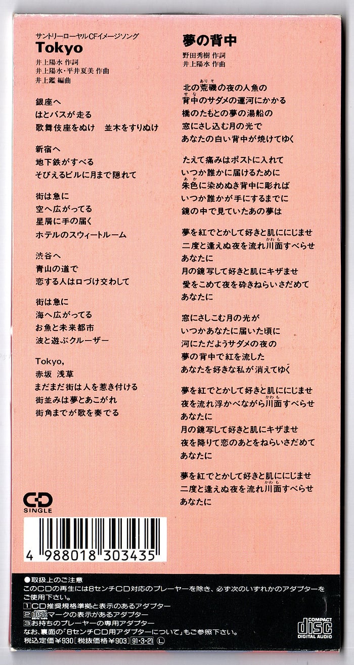 1991年発売、井上陽水の29枚目のシングル「Tokyo」です。前1990年のアルバム「ハンサムボーイ」収録曲で、SUNTORYウイスキー〈サントリーローヤル〉CMソングに採用されシングル・カットされました。