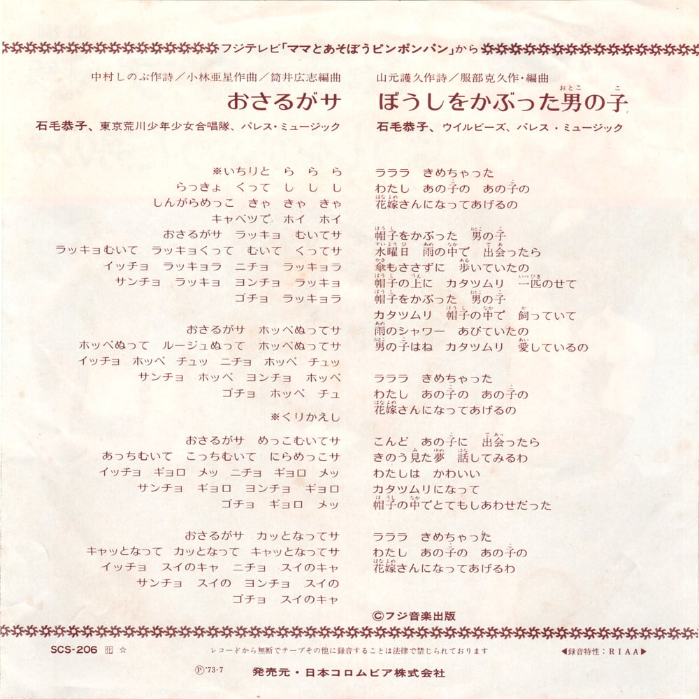 1973年発売、石毛恭子お姉さん時代のピンポン盤(=〈ママとあそぼう ピンポンパン〉関連盤)「おさるがサ」です。コロムビア盤。