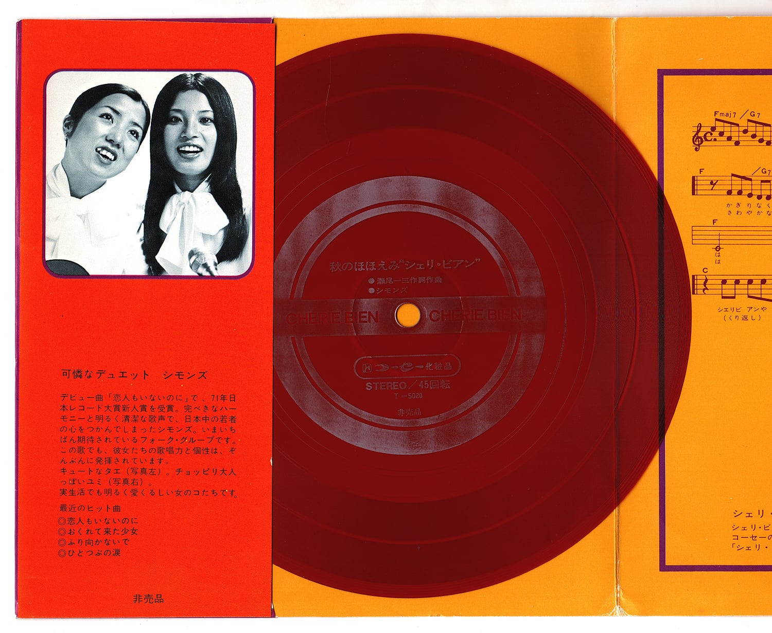 コーセー化粧品の販促フォノシート(ソノシート)、女性フォーク・デュオ、シモンズが歌う「秋のほほえみ ❝シェリ・ビアン❞」です。リリース年は記載されていませんが、おそらく1972年秋のキャンペーン・ソング。